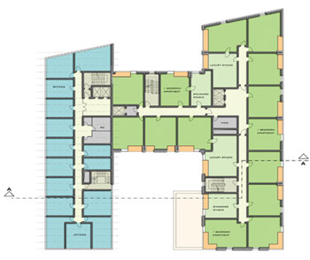 Eine großzügige Eingangshalle empfängt den Besucher und leitet weiter in das angegliederte Restaurant oder den großzügigen Konferenzbereich. Im 2. - 8.OG befinden sich die Gästeappartements, wobei die größeren, exklusiven Appartements zum Wasser hin ausgerichtet sind. Der Besonderheit des Standortes wird durch das komplette Öffnen der Fassade zum Hafenbecken hin Rechnung getragen. Die Appartements sind warm und gemütlich eingerichtet und bieten eine wohnliche Alternative zum Hotelleben. Ein zweigeschossiger Fitnessclub mit Pool liegt im Erd- bzw. Untergeschoss des Gebäudes.