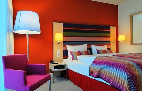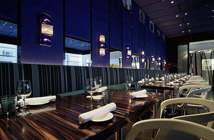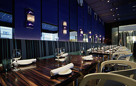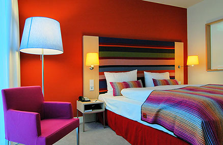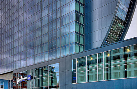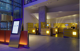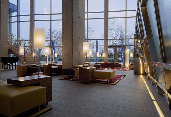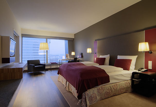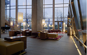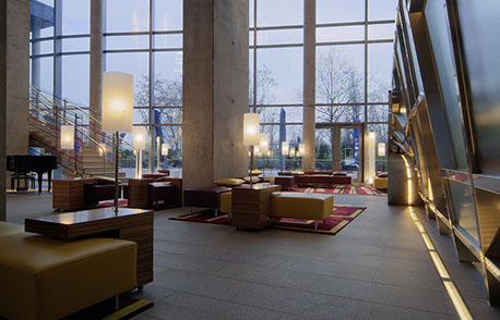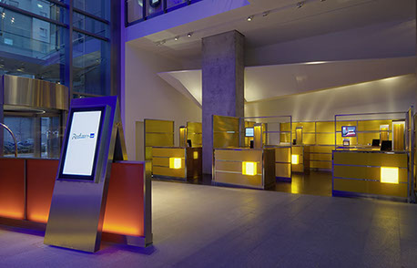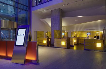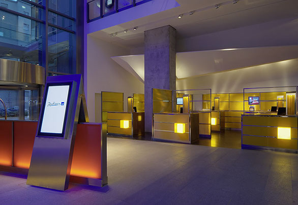 Das Radisson Blu Hotel, Frankfurt liegt in der Nähe der Messe Frankfurt im Westen der Stadt. Die blaue Scheibe des Hauptgebäudes bestimmt die umgebende Architektur. Eine zweigeschossigen Eingangshalle leitet vorbei an der Rezeption in die Brasserie und das Restaurant, sowie in die Cigar Bar. Ein hängendes Weinregal aus Stahl und Glas teilt die 2000m² große Halle eindrucksvoll.