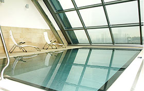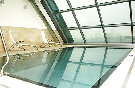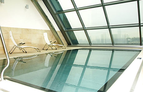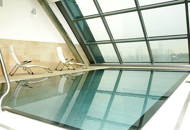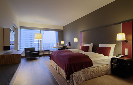 Eine frei hängende Treppe führt in das 1.OG zum Business Center sowie in den großen, in zwei Bereiche teilbare, Ballsaal. Im 2.-17.OG befinden sich die Gästezimmer, wobei die Standardzimmer im Inneren und die Executive Lounges, die Suiten und die Präsidentensuite in den Flügelbereichen der Scheibe angeordnet sind. Ein Fitnessclub mit Pool liegt im 18. OG und bietet dem Besucher einen grandiosen Ausblick auf die Skyline von Frankfurt.