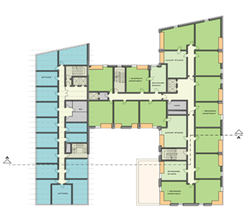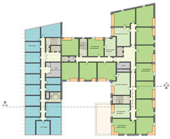 Eine großzügige Eingangshalle empfängt den Besucher und leitet weiter in das angegliederte Restaurant oder den großzügigen Konferenzbereich. Im 2. - 8.OG befinden sich die Gästeappartements, wobei die größeren, exklusiven Appartements zum Wasser hin ausgerichtet sind. Der Besonderheit des Standortes wird durch das komplette Öffnen der Fassade zum Hafenbecken hin Rechnung getragen. Die Appartements sind warm und gemütlich eingerichtet und bieten eine wohnliche Alternative zum Hotelleben. Ein zweigeschossiger Fitnessclub mit Pool liegt im Erd- bzw. Untergeschoss des Gebäudes.
