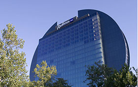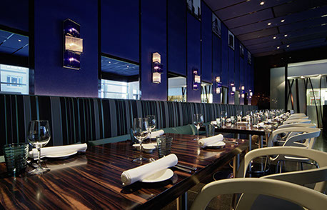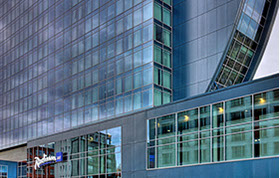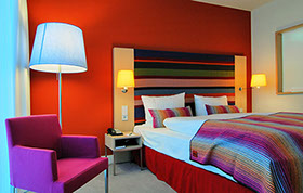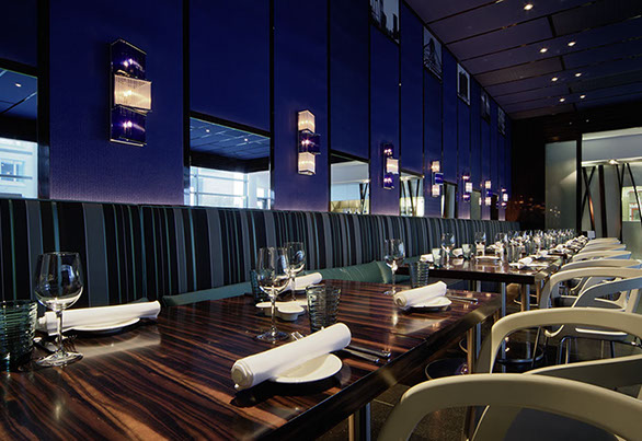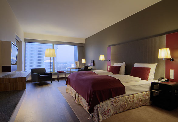 Das Radisson Blu Hotel, Frankfurt liegt in der Nähe der Messe Frankfurt im Westen der Stadt. Die blaue Scheibe des Hauptgebäudes bestimmt die umgebende Architektur. Eine zweigeschossigen Eingangshalle leitet vorbei an der Rezeption in die Brasserie und das Restaurant, sowie in die Cigar Bar. Ein hängendes Weinregal aus Stahl und Glas teilt die 2000m² große Halle eindrucksvoll.