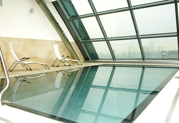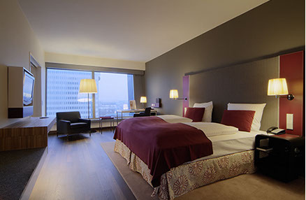 Eine frei hängende Treppe führt in das 1.OG zum Business Center sowie in den großen, in zwei Bereiche teilbare, Ballsaal. Im 2.-17.OG befinden sich die Gästezimmer, wobei die Standardzimmer im Inneren und die Executive Lounges, die Suiten und die Präsidentensuite in den Flügelbereichen der Scheibe angeordnet sind. Ein Fitnessclub mit Pool liegt im 18. OG und bietet dem Besucher einen grandiosen Ausblick auf die Skyline von Frankfurt.